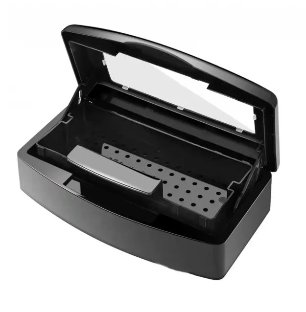 Зовні кришка, яка при закритті занурює піддон із інструментами на дно. Місткість наповнюється розчином для дезінфекції або стерилізації, в неї занурюються манікюрні інструменти та насадки.