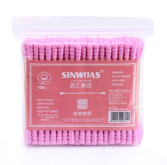 Палички ватні бамбукові Sinwuas в пакеті (100шт/уп), подвійні рожеві